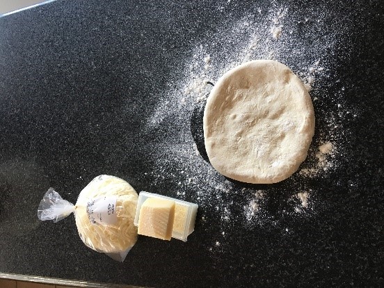 3) With flour on the counter, stretch out the pizza dough so that it is slightly larger than the bottom of the skillet.  Let this rest on the counter (it will pull back a bit).