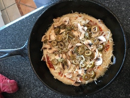 9)  Put the cast iron in the oven for 12-14 minutes until brown and pizza-like on the top.