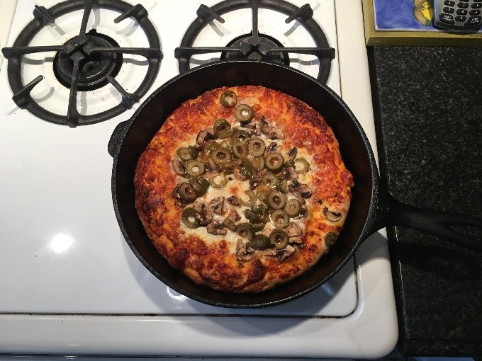 This recipe was delivered to my neighbors in March 2020. Yep, a COVID Cast Iron Pizza. You see, I have wonderful neighbors, and am lucky to have a neighborhood Italian Deli (which my daughter grew up eating school sandwiches from). Our neighborhood shared with each other as we learned what the future would be. This is the best lesson I learned during the pandemic.