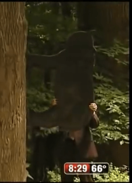 Yes, you can see this one coming…. the reporter is standing on his tippy-toes demonstrating how a standing bear would look if he (the bear, not the reporter, which as we have said would NOT surprise us) could stand sideways on the tree defying the laws of gravity.