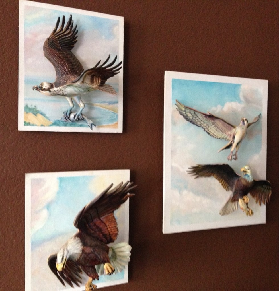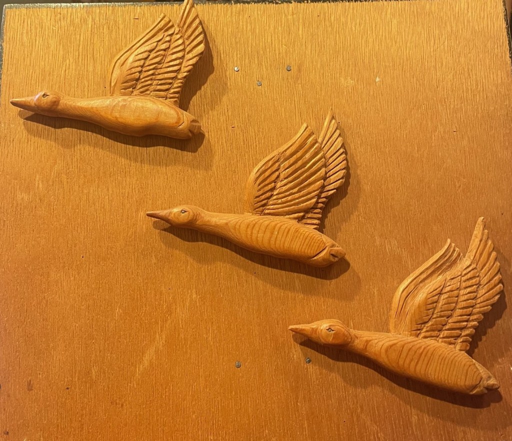 Their 2 room apartment was covered in “picture boxes”, dioramas where he painted the background and carved the foreground. Flocks of birds covered every surface.