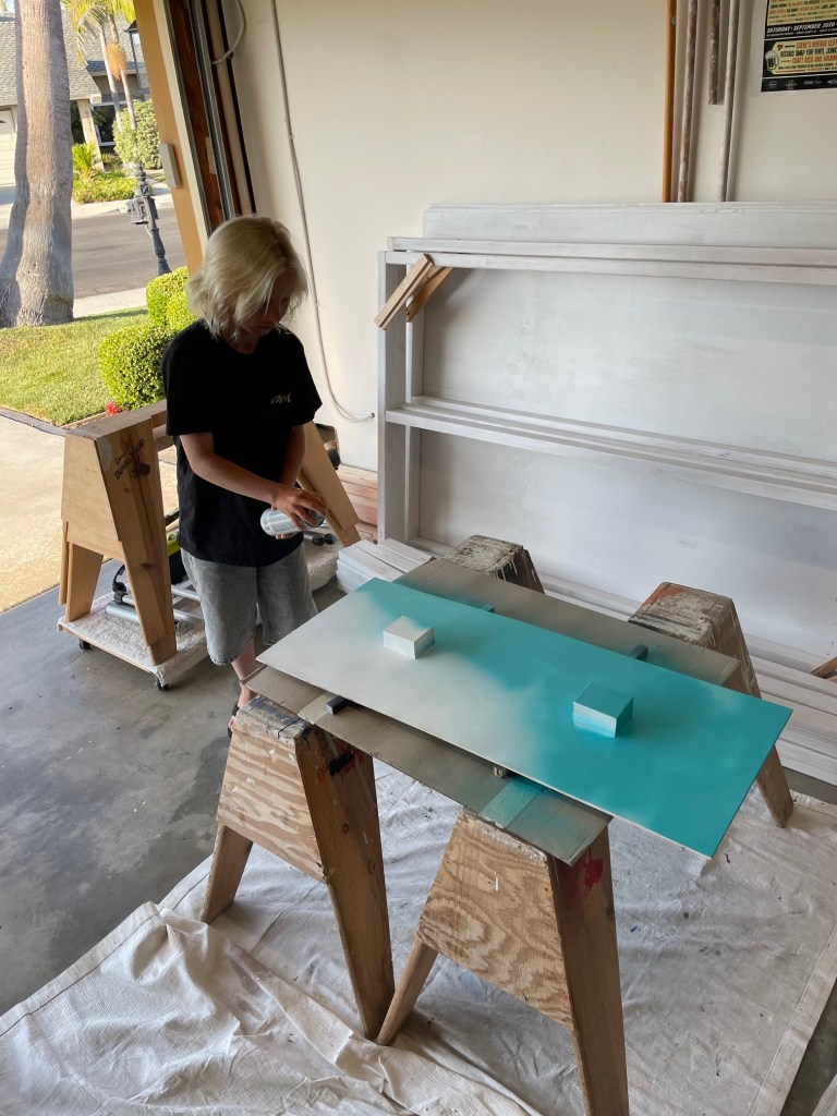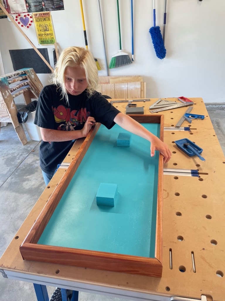 Which brings us to Gunnar. Gunnar is one of the great kids in my neighborhood. He’s unfailingly polite and very sweet. So, when he came home with a gold-colored skateboard signed by Tony Hawk, I offered to help him make a skateboard mounting frame. I had a blast. Working with him reminded me of when I was his age, working with my grandfather.